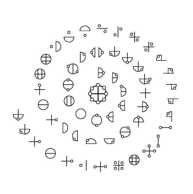 Katakamuna characters are composed of combinations of meaningful geometric figures. By simply looking at the character’s form, one can infer its general meaning, because the symbols are imbued with deep meaning, much like pictograms.